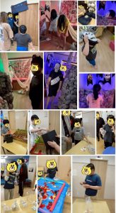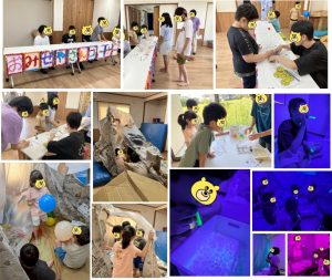 ちょこれいとでは「どうしたら楽しいかなぁ?楽しんでもらえるかなぁ?」お化け屋敷づくりや看板を作りました。ビニールと新聞で作った秘密基地やしょぼん玉を使った化学実験も体験しましたよ。