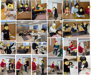 今年のクリスマス会は、クリスマスに因んだイラストで自分で作ったカードを使ってのビンゴゲーム大会。ビンゴになった人から「お菓子のプレゼント」をサンタさんにもらってうれしそうです♪